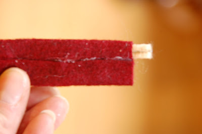 9 - Take your piece of 2"x4 1/2" piece of felt and your pipe cleaner. Run a line of hot glue along the top of the felt and pull it down approx. 1/2" covering the pipe cleaner. Then, run a line of hot glue on that seam and pull the bottom of the felt to meet it. Look at the photo if that isn't too clear.