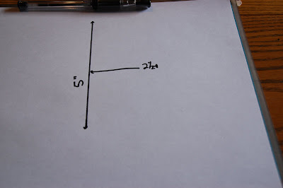 11 - Now it's time for his cape. To make the pattern just draw a 5" line on a piece of paper. Then out from the center measure 2 1/2" and make a dot. Take a plate and use the round arch to meet the middle dot at 2 1/2" from one end of the 5" line. Then do it from the other end.