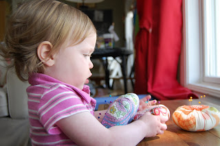 I now constantly have a helper when I sew. She is my baby girl and her favorite toy upstairs is the pincushion. I know it's not safe, but she is attracted to mine like a magnet. When I made some pincushions this week for upcoming birthdays, she screamed when I took them away. Finally, I had them downstairs on the bench and she found them right away. I am not sure if this is an early sign for her future in sewing or she just likes to play with sharp objects. Either way, I need to hide them better!